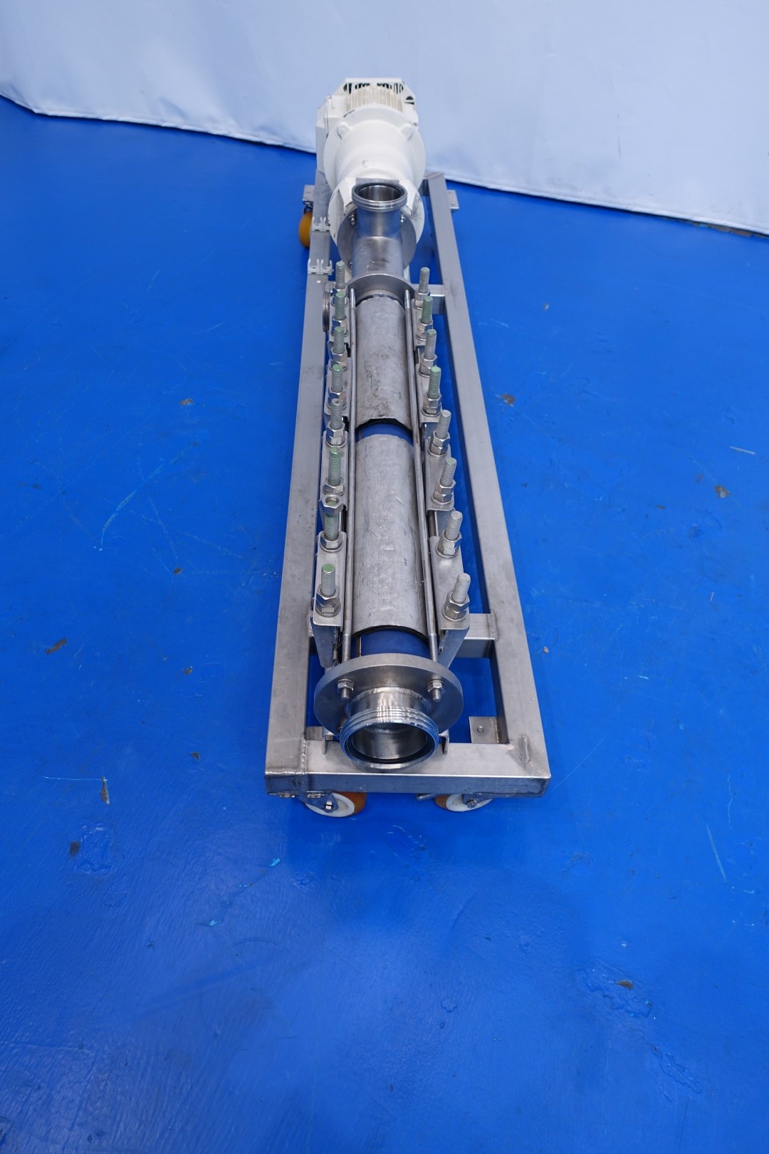 Mono pump - progressing cavity pump. Stator diameter Ø 40 mm. Stator length ca. 83 cm. Several Windings. Pressure 16 bar (max 24 bar). Current motor: 4,0 kW - 400-300 rpm. Mounted on mobile SS frame. Stator is retensionable. Connections: (In) DN80 Din / (Out) DN80 Din - 1 x bypass DN50 Din. Total dimensions: 194x45x46 (lxwxh) cm - weight: 155 kg.