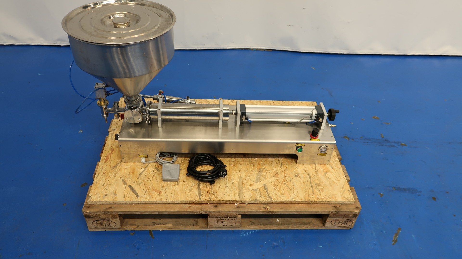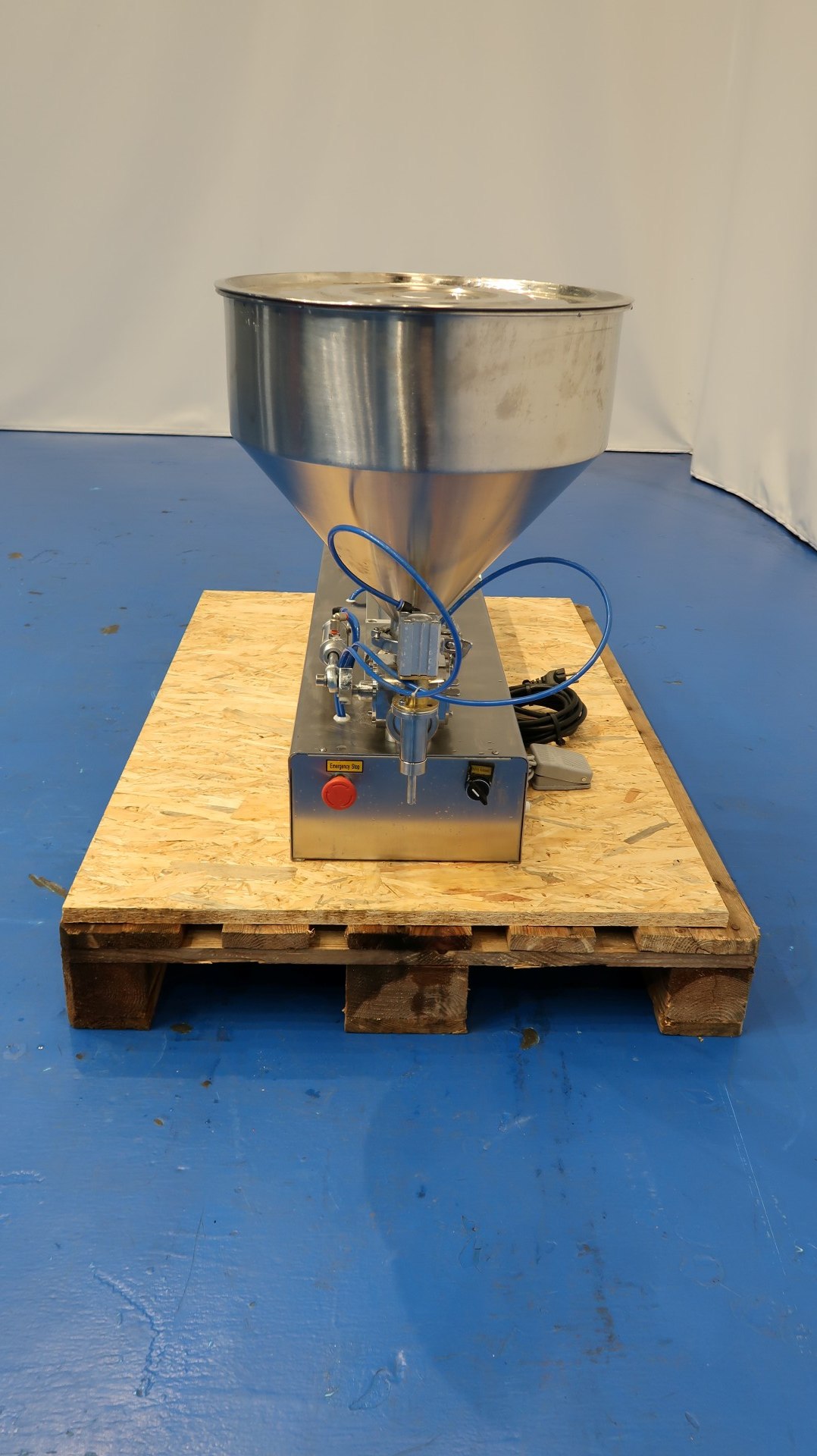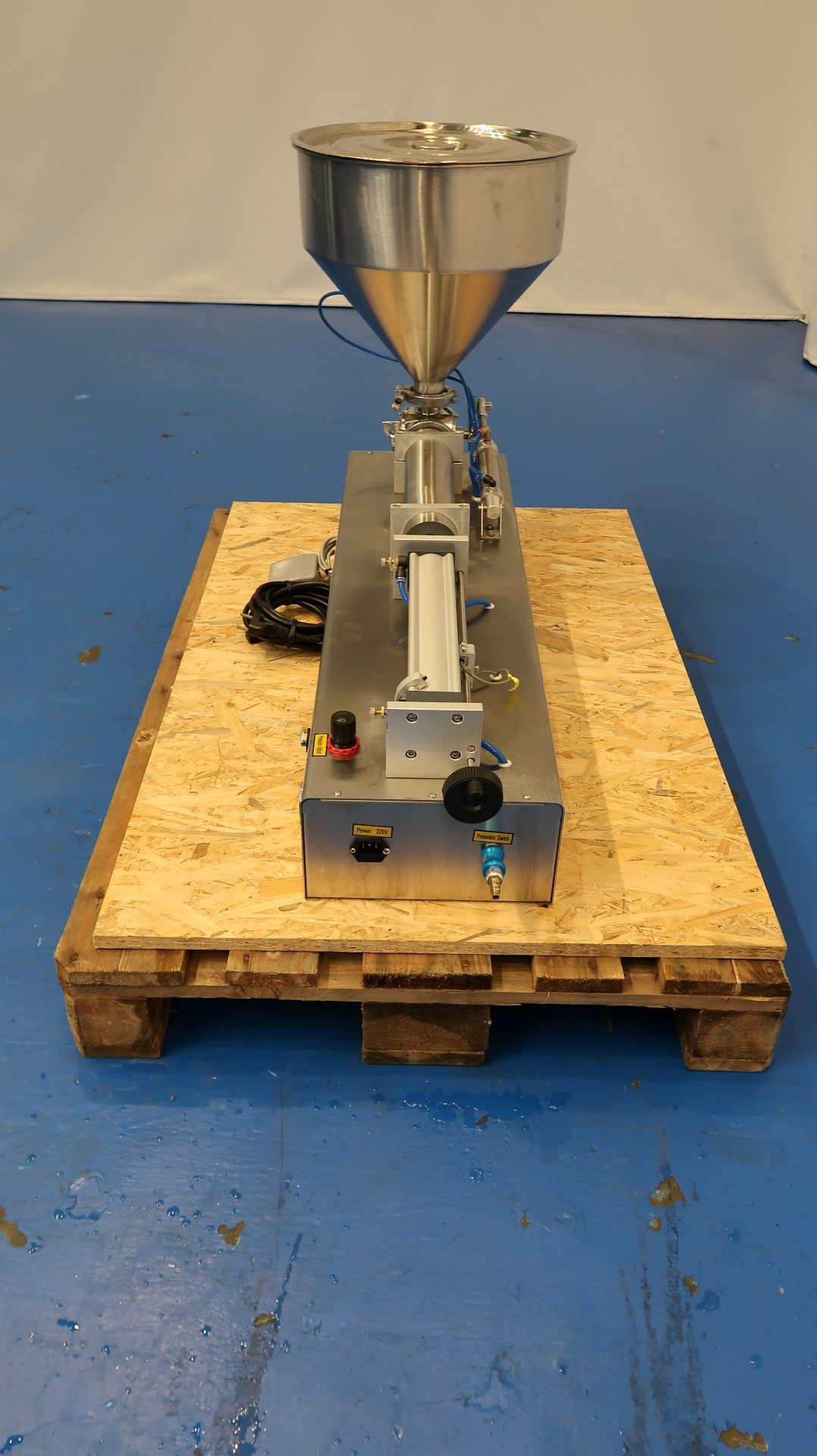 Table top semi-automatic pneumatic single head paste filling machine. Can run automatic and by foot control. Filling range 5-100 ml. Filling speed: 10-30 bottles/min. SS hopper capacity ca. 30 liter. Power: 220V - 10 W - 1A. Needed air pressure: 0,4-0,6 Mpa. Total dimensions: 115x42x65 (lxwxh) cm - weight: 60 kg.