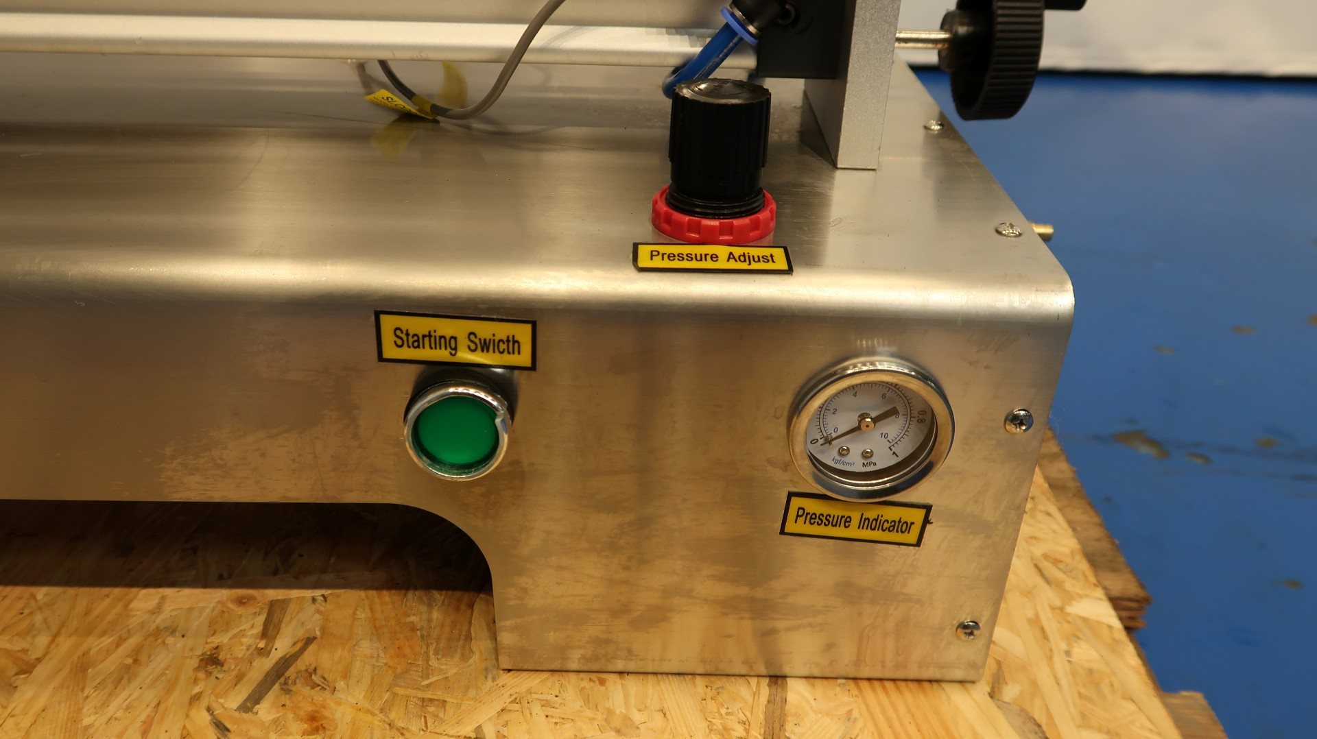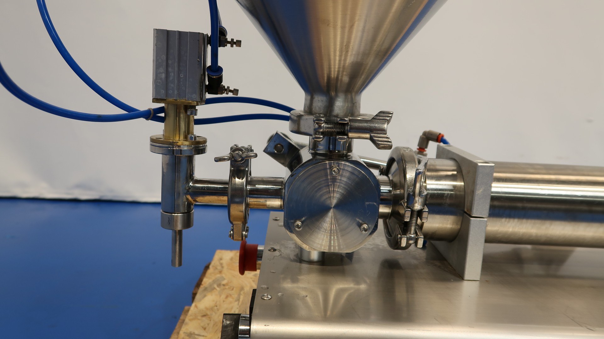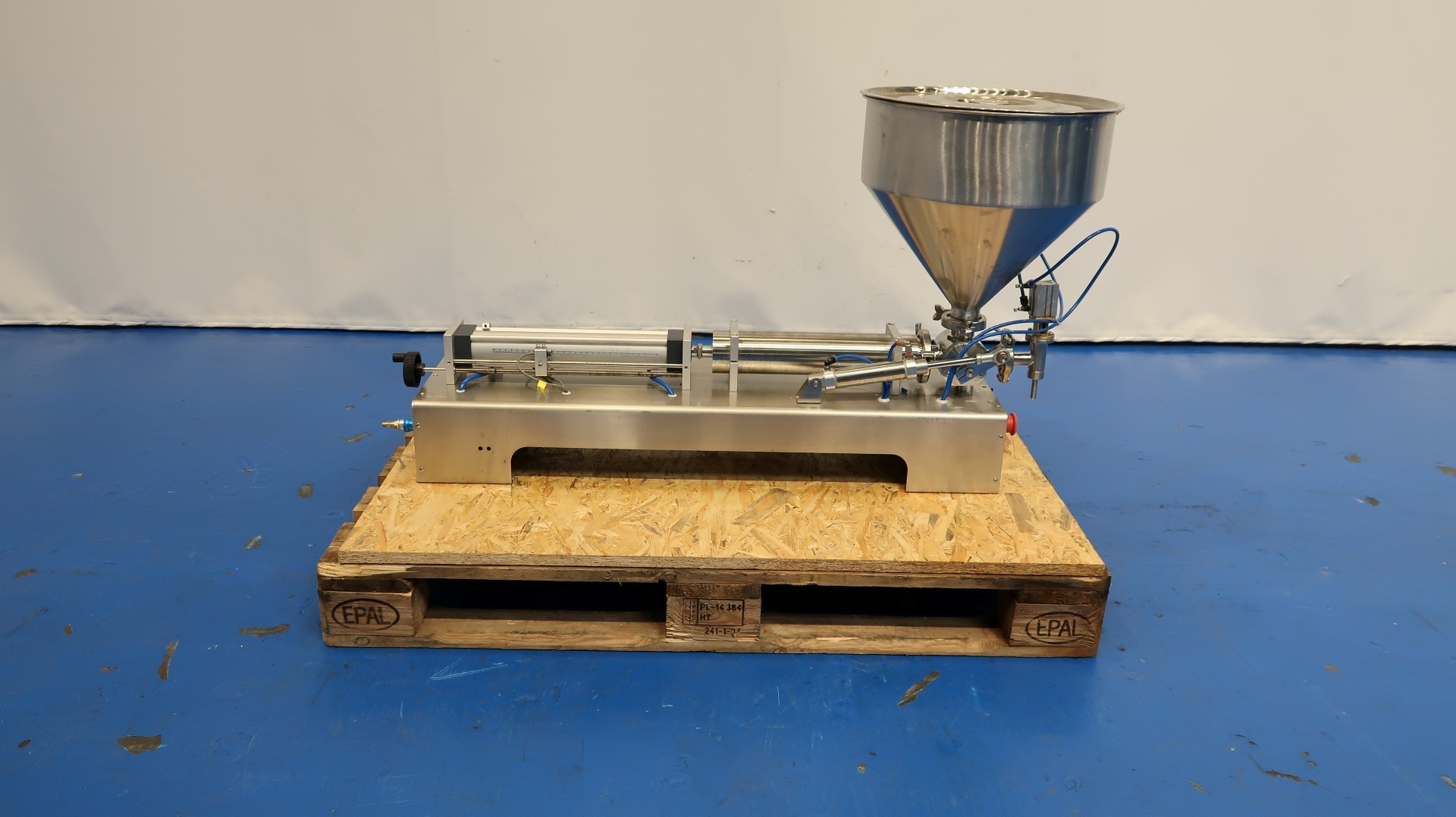 Table top semi-automatic pneumatic single head paste filling machine. Can run automatic and by foot control. Filling range 5-100 ml. Filling speed: 10-30 bottles/min. SS hopper capacity ca. 30 liter. Power: 220V - 10 W - 1A. Needed air pressure: 0,4-0,6 Mpa. Total dimensions: 115x42x65 (lxwxh) cm - weight: 60 kg.
