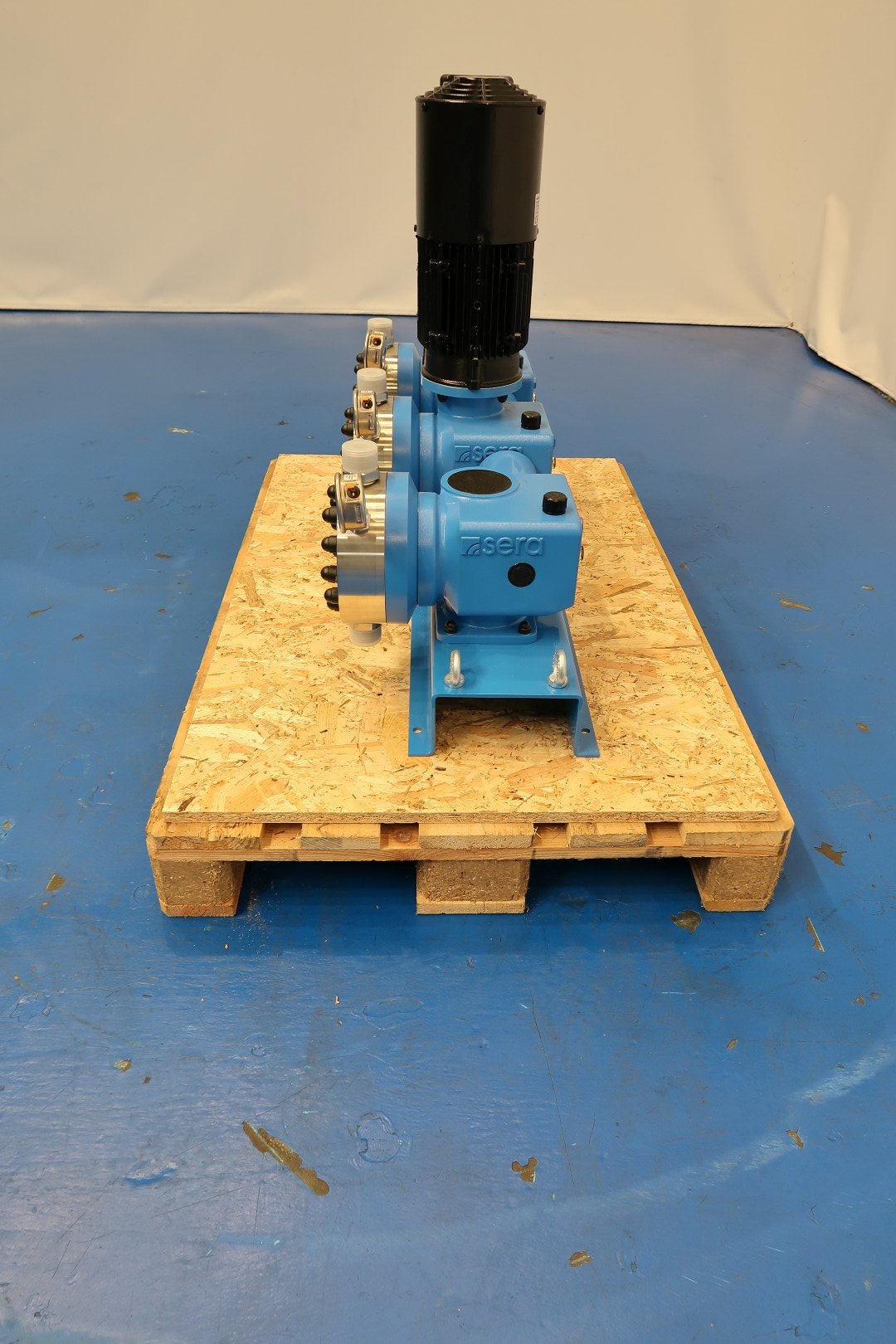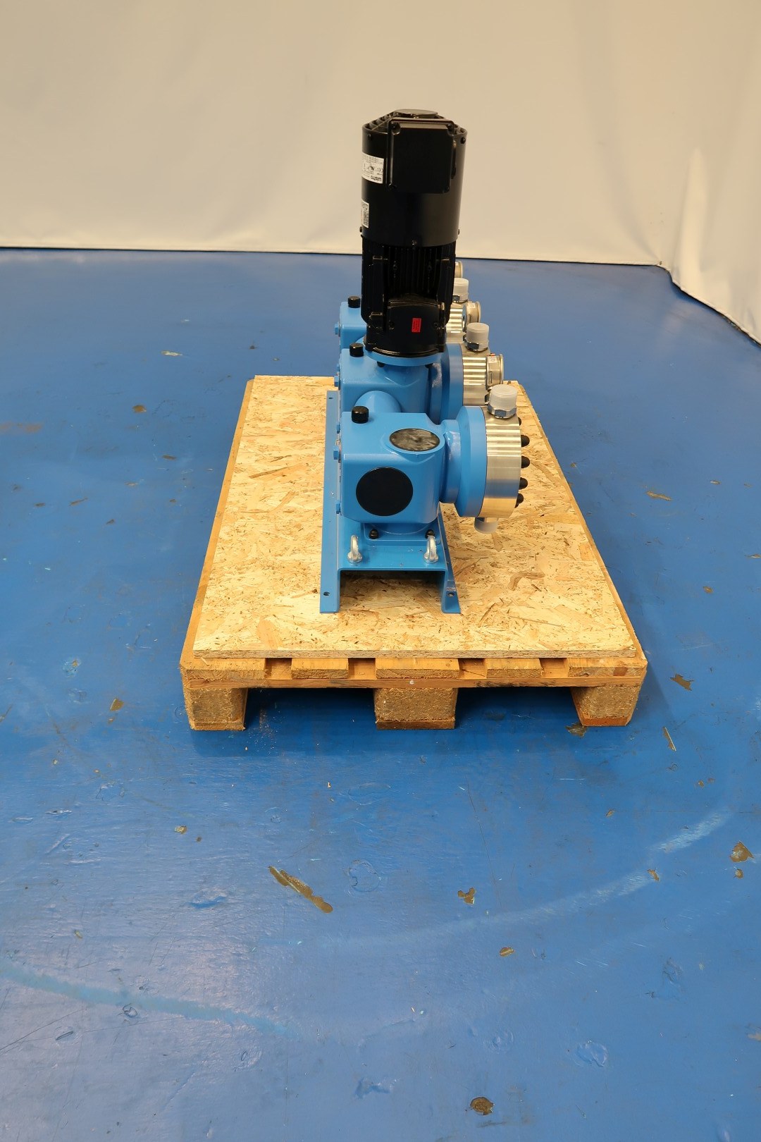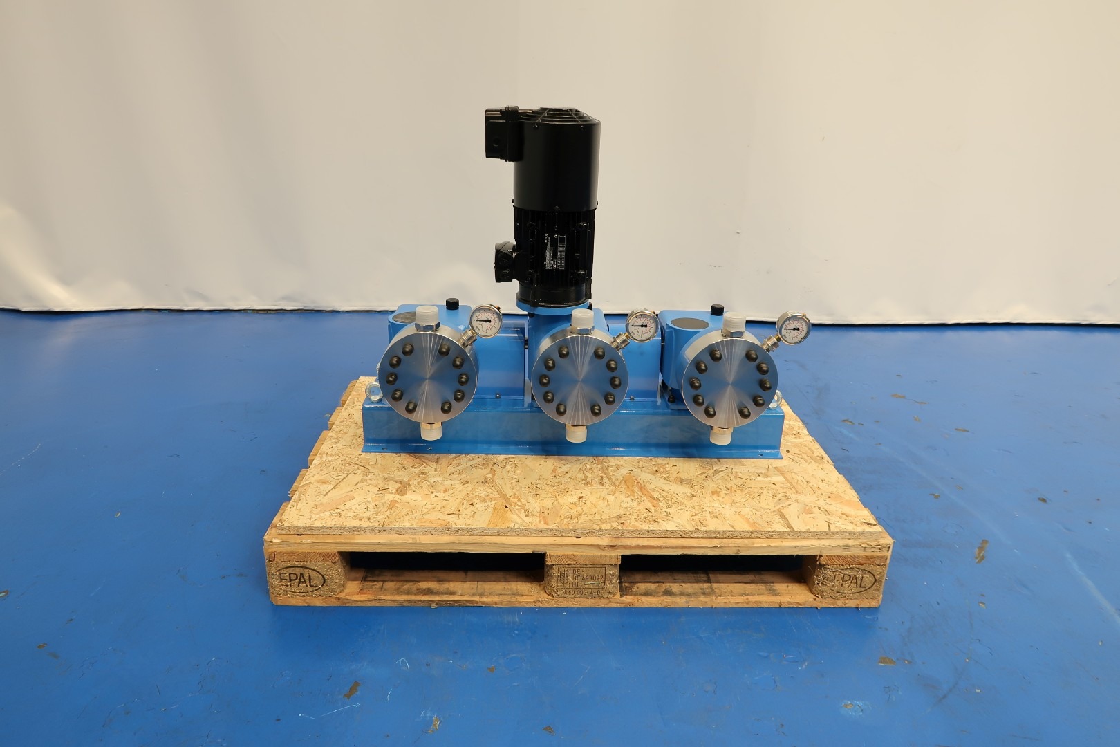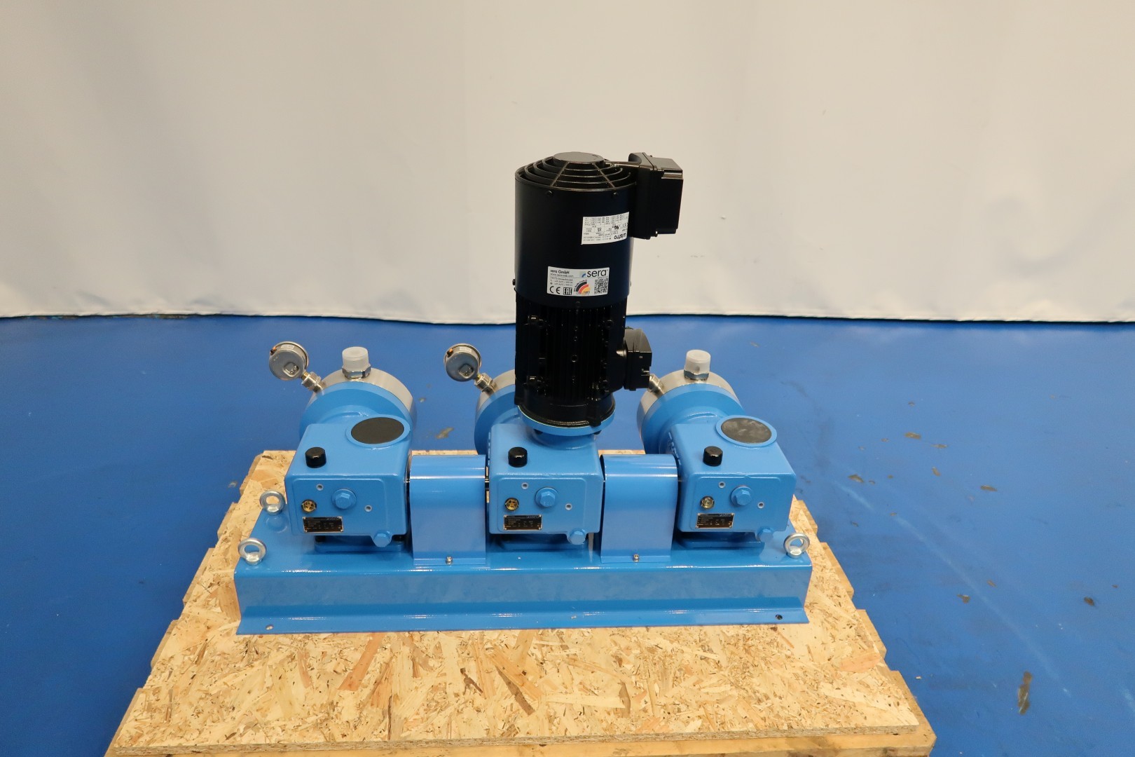 Dosing pump set, new - never used. Frame with 3 pumps (nomimal 5-500ltr/h each pump so total up to 1,500ltr/h) and 1 motor with forced cooling. Lammers motor: 1,1 kW - 2,4 A - 1.440 rpm - 50 Hz. Wistro forced Fann. Pressure in P1 min/max: -0,3/0 bar. Pressure P2 out max: 10 bar. Each pump with pressure manometer. Documentation: Technical manual (English) available. Total dimensions: 95x33x74 (lxwxh) cm - weight: 152 kg.