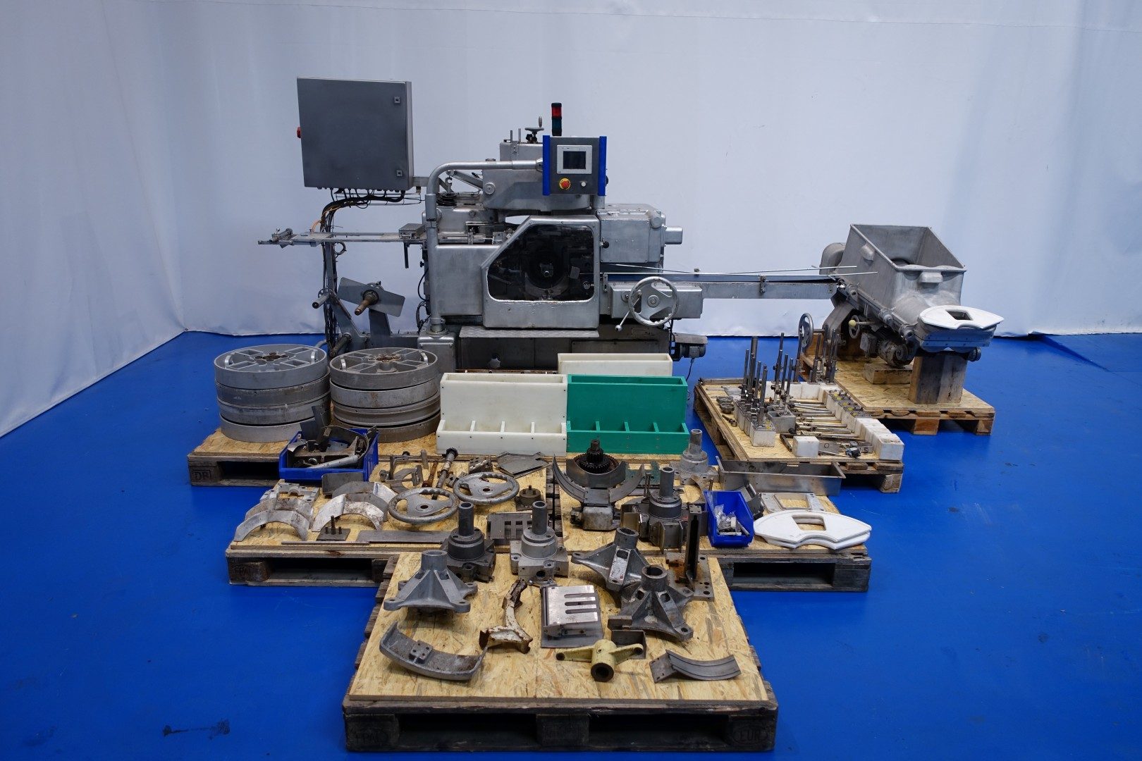 Full Automatic filling and wrapping machine for butter in aluminum foil or parchment paper. Original type FD100, converted to F100. Product feed by trough and augers. No date coder or photo cell. Outfeed conveyor of 150 cm length. Format 106x65x40mm 250gr incomplete. + several format parts (incomplete). Control panel with PLC control (Hitachi EH-150) operator controls by toch screen HMI. With a lot of F(D)100 parts. Total dimensions: 354x135x188 (lxwxh) cm - weight: 2.620 kg.