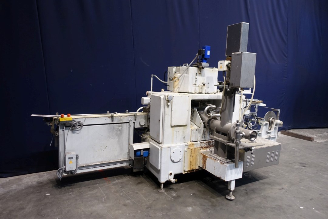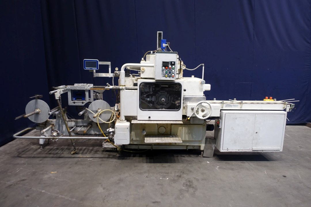 Full Automatic filling and wrapping machine for butter in aluminum foil or parchment paper. Product feed by direct link up with pneumatic compensator and with liniair potentio meter to control feed pump. Over pressure valve on infeed pipe. Date coder by embossing ink (Videojet DataFlex 6330). Photo cell for print centring device (paper correction by spot mark). Automatic weight adjustmentt by servo drive, double foil reel holder for easy switch over, roll Outfeed conveyor length: 190 cm, width: 17 cm. Format sets on this machine: 250 gram, 100 x 75 x 35 mm. Control panel with relay. Total dimensions: 456x193x221 (lxwxh) cm, weight: 2.960 kg's. Also available in complete line with metal detector (STN15448), intereconnecting conveyors and packer (STN15444).