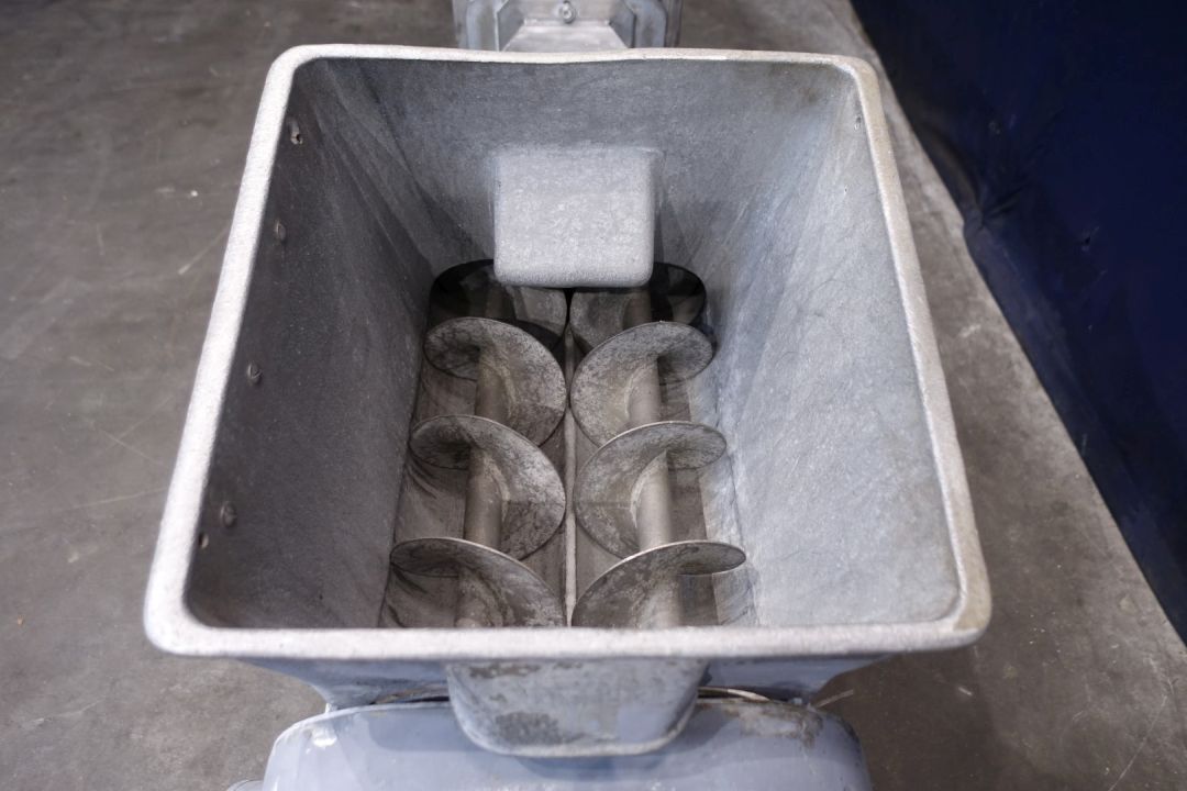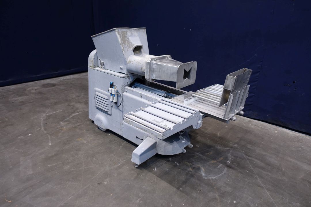 Semi automatic bulk packer. Packaging of butter in blocks of 5 to 25 kg. Cardboard box filling. Manual weight adjustment. Direct infeed via hopper. With roller wheels to side, side rolling table. Total dimensions: 180 x 95 x 124 cm.