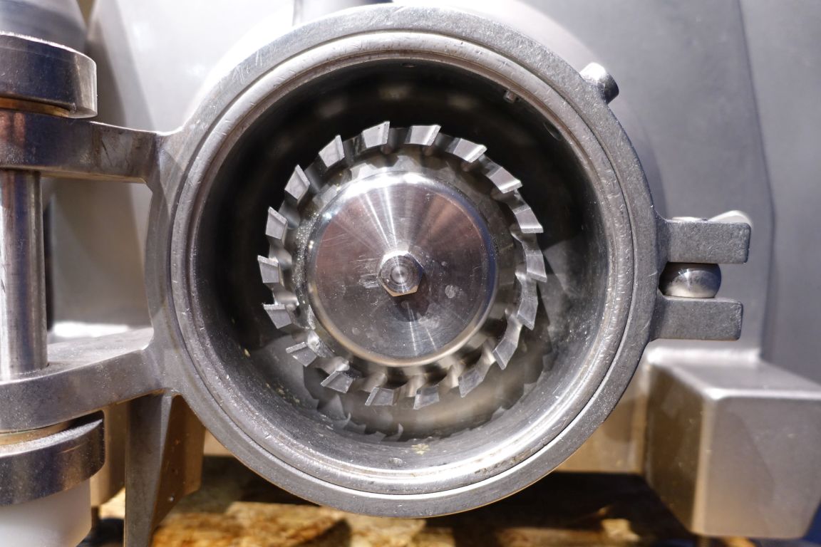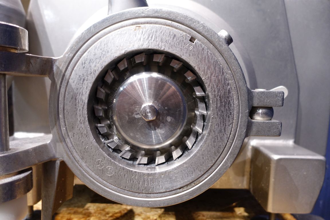 inlijn Emulgator with hopper, 2 stage, with control panel. knives 2x 0.7mm Motor details: power : 30KW, speed 2.950rpm, 59A, 400V, type 200L.20. Emulsifying and pumping function up to 12.000ltr/h at 2bar. already rebuild upgraded seals up to 5bar, inlet 5" pipe with 90° Bend but also hopper infeed available (dismantled).