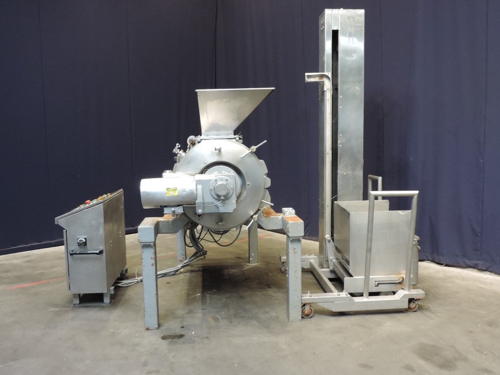 Universal horizontal mixer-cooker. The main product bowl and cover are double jacketed for cooling or heating (no valves on jacket), no vacuum. Hydraulic unit for moving inlet slide and outlet slide on bottom. Top inlet and the main front lid have 2 manual tightening clamps and contact sensor, infeed hopper. 2 agitators: 1 scraper agitator, 25 rpm and 1 mixer knife, motor 22 kW - 710 rpm. Total electrics: 27 kW - 60 A - 380 V -50 Hz. steel frame. Including elevator for trolleys 200ltr with controls cabinets on elevator and machine. Documentation available. Outside dimensions: 2,5 x 4,25 x 3,25 meter. Total weight: 1960 kg.