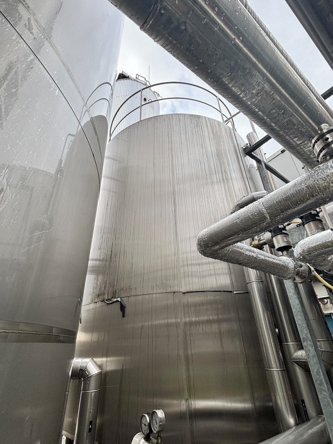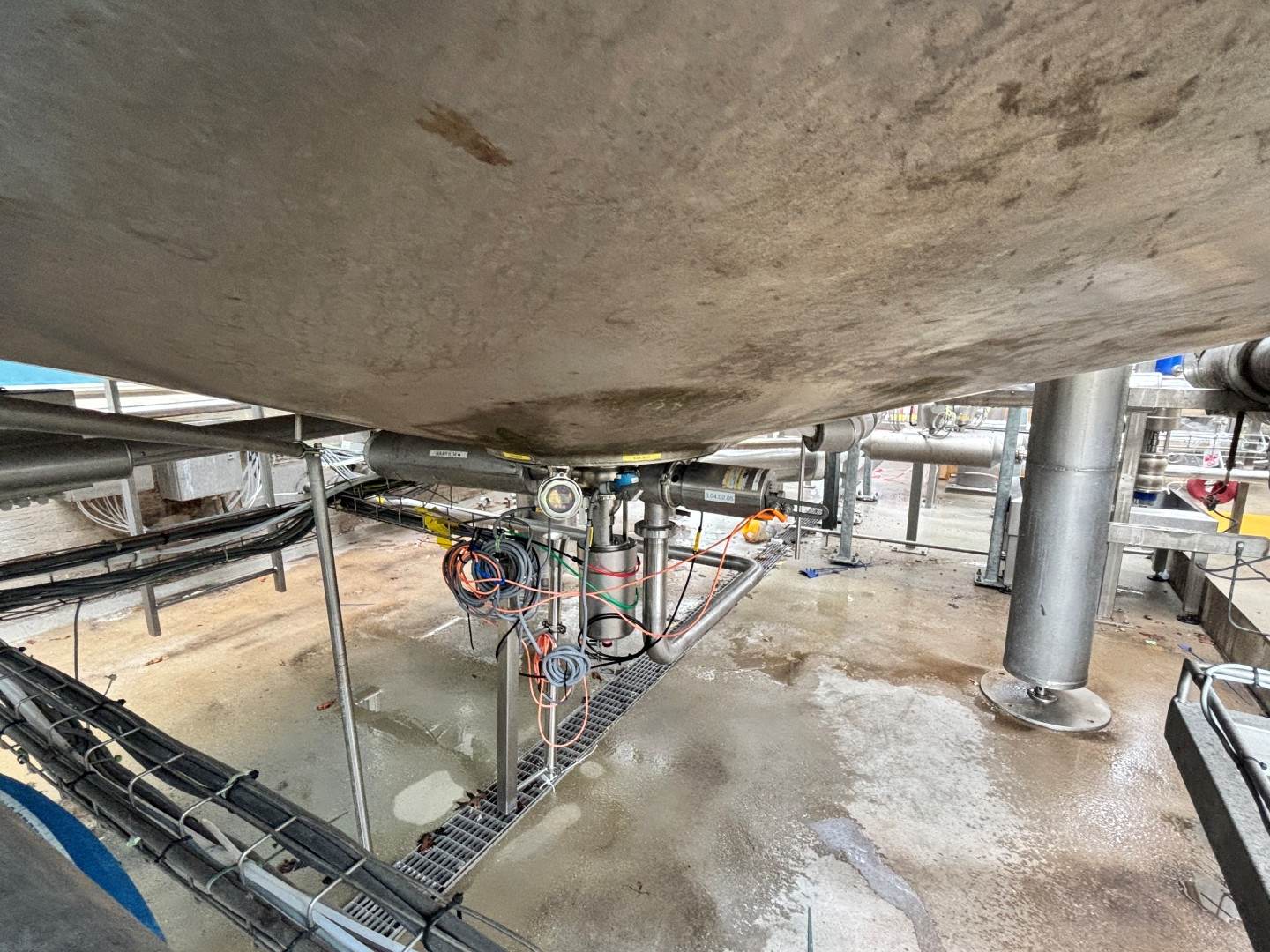 Vertcial double jacketed insulated cream and milk storage and cooling tank. Nominal volume: 35.000 liter. Design pressure: atmosperic (tank) 4 bar (jackets). Design temperature: 100°C (tank and jackets). Topside driven multi-blade agitator, motor: 2,2 kW speed n2: 24 rpm. Insulated, side and bottom. With 2 x cooling sections: bottom 25 ltr and jacket 25 ltr. Previously used for cream storage and cooling via glycol from 8°C -> 4°C; capacity 0,5°C per hour. Product outlet 2,5" Hovap variflow pneumatic tank outlet valve. Outlet height: 80 and 94 cm. With cleanable Sample valve. In bottom 3 x sensor: temperature, pressure and level. High: 1x level. In top: sight glass and breather. 2 CIP spray bowls. Manhole in top, round +/- Ø 50 cm. 4 Adjustable feet. Inside dimensions of tank: Ø 320 cm and cylindrical lenght 386 cm. With stainless steel cage ladder mounted on side. Documentation inculding drawings available. Total dimensions: Ø 349 x 655 cm. Weight: ca. 4.100 kg.