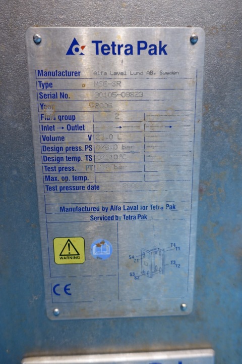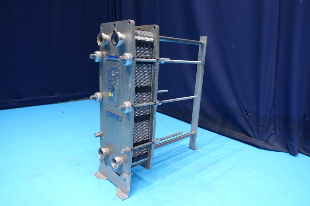 Plate heat exchanger, sanitary (PHE). Design pressure: 6,0 bar. Beam length: 74,5 cm, connections: 2" SMS. Current configuration: 1 Section: 30 plates - Connections head: 2 up/2 down, follower 2 up. Total dimensions: 84x34x91 (lxwxh) cm - weight: 122 kg.