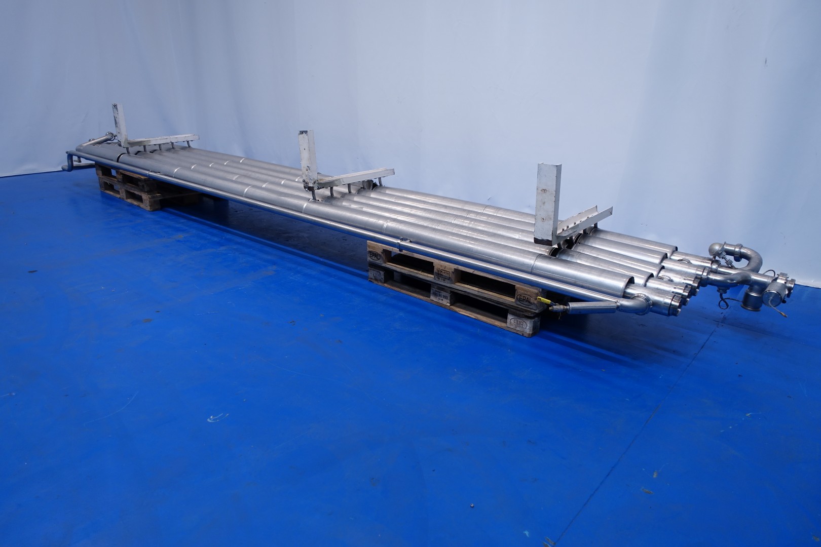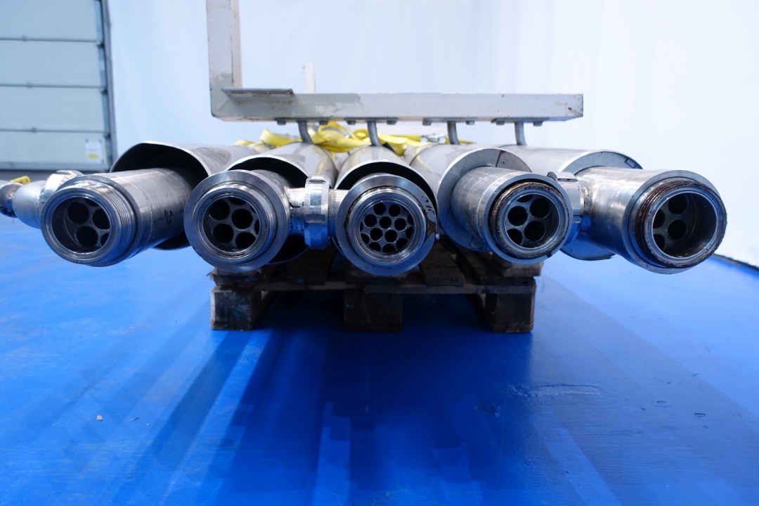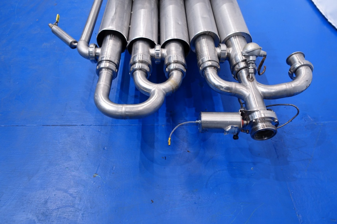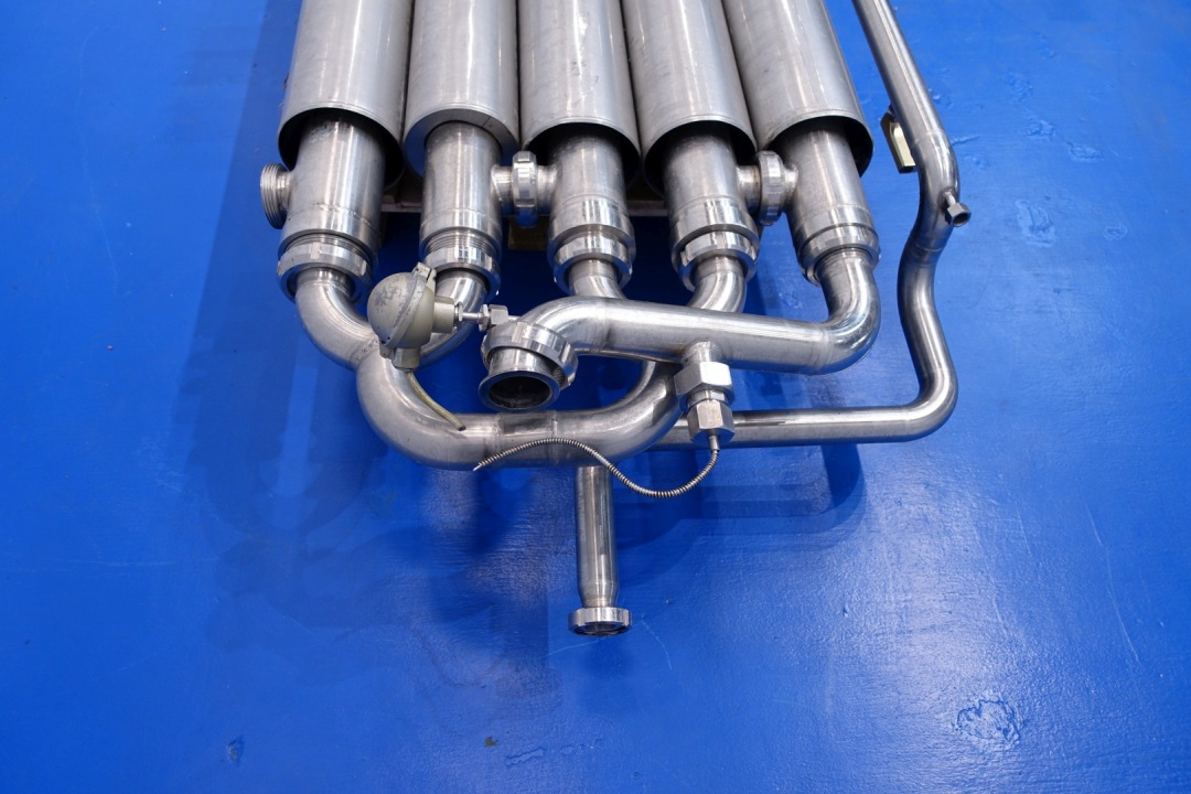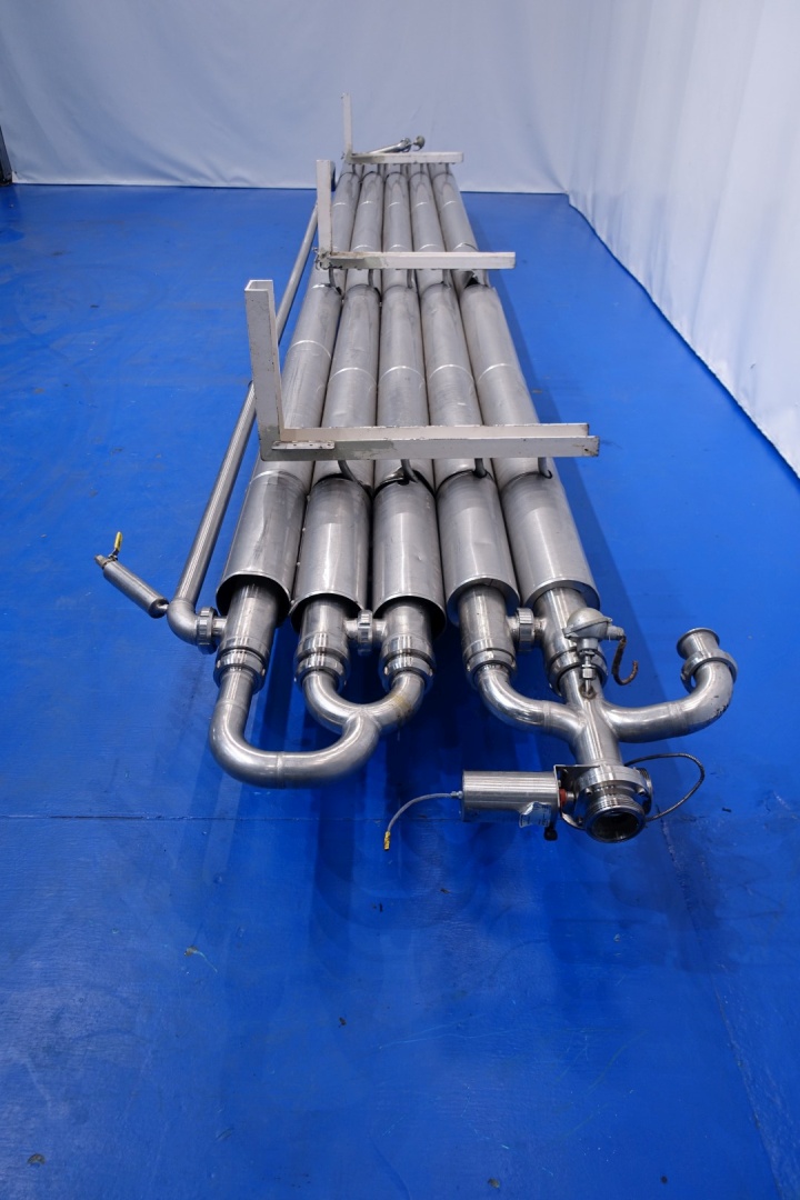 Double jacketed and insulated tubular tube heat exchanger. Set of 5 tubes. Multitube, scheme: 2 x 2 in parellel en 1 in serial. Effective length 6mtr. 4 Tubes outer diameter 105 mm and 1 outer diameter 115 mm. 4 Tubes with 7 inner tubes - diameter 22 mm and 1 Tube with 19 inner tubes diameter 13 mm. Total surface per tube (7x Ø22mm): 2,9 m2 and tube (19 Ø13mm): 4,65 m2. Total surface for complete set: 16,27 m2. Former used as remelt tube form margarine. Total dimensions: 680x135x63 (lxwxh) cm - weight: 580 kg.