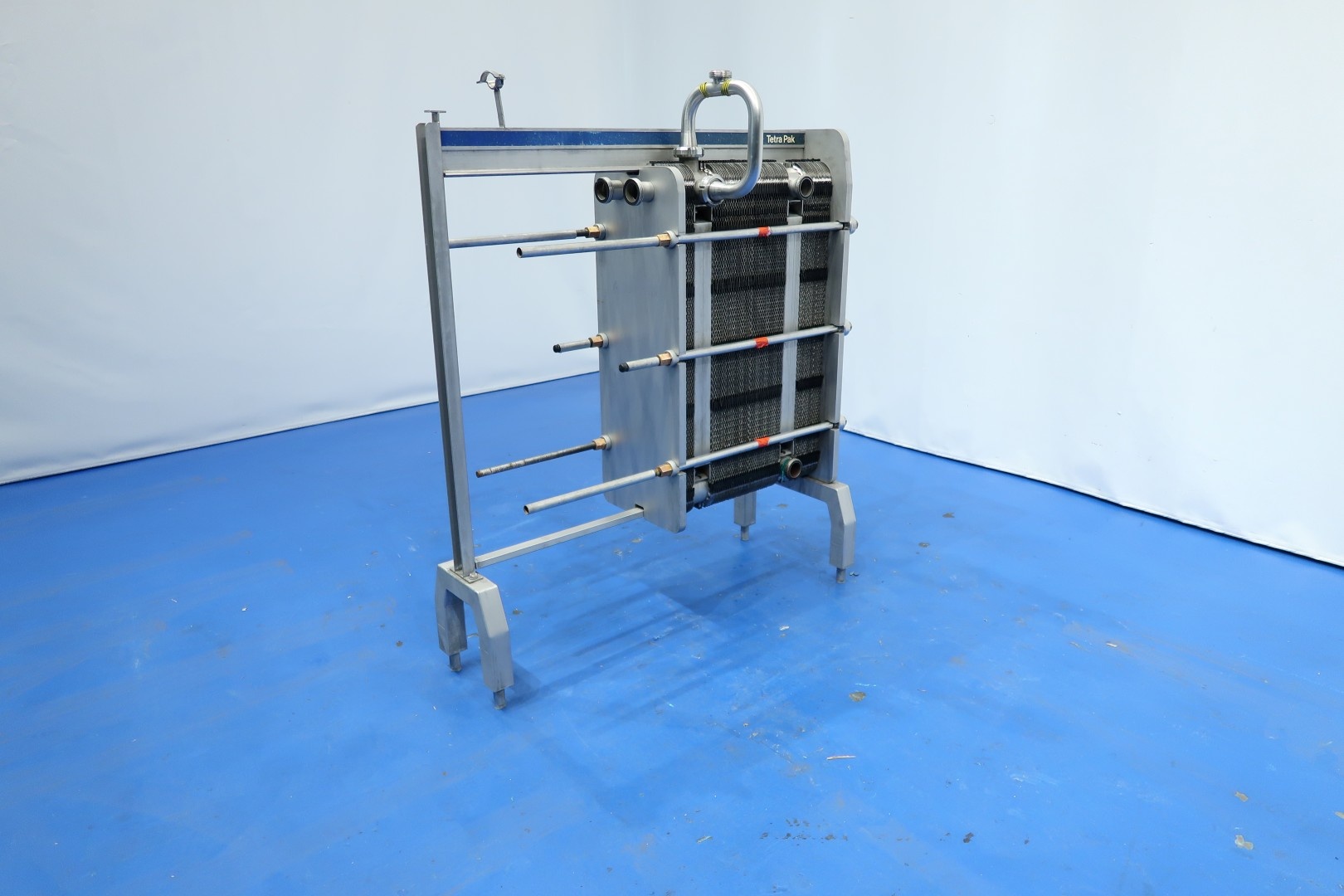 Cream pasteuriser skid mounted, model: Tetra Therm skid mounted with balance tank, centrifugal pumps (feed and booster pump), holding tube and Alfa Laval C6 plate heat exchanger 3 sections, regeneration, heating and cooling by icewater. Thermal cycle: 55-95-4°C, steam valves, steam hotwater heatexchanger, water pump, sensors, control box with temperature recorder. P&ID available and documentation (component information) included. Dimensions skid: 260x160x236 (lxwxh) cm - weight: 559 kg - plate heat exchanger weight: 431 kg.