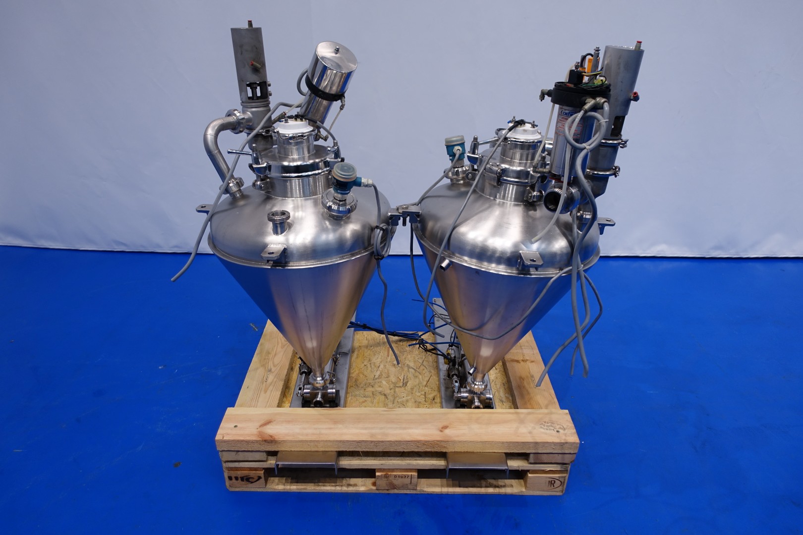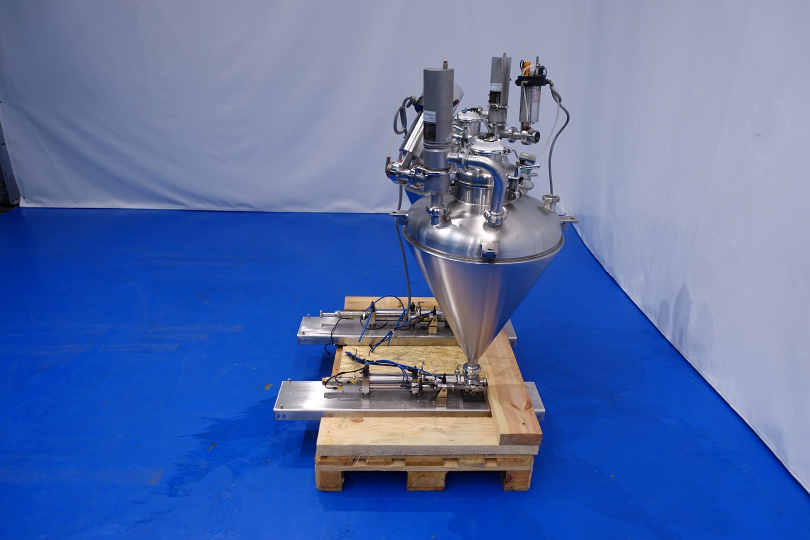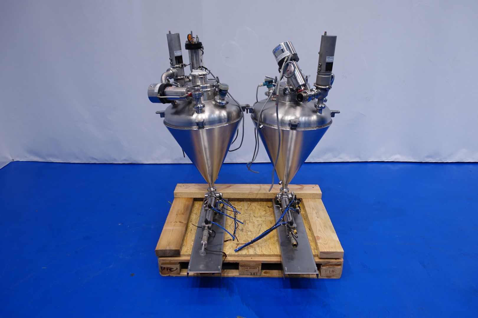 Set of 2 Piston dosers with double jacketed hoppers. Capacity dosers: approximately 100-250ml. 2 x Double jacketed hoppers, each with 1x spray bowl (CIP cleanable). Capacity hopper ca. 95 liter. Spare parts manual available. Total dimensions (lxwxh): 120x107x134 cm - weight: 217 kg.