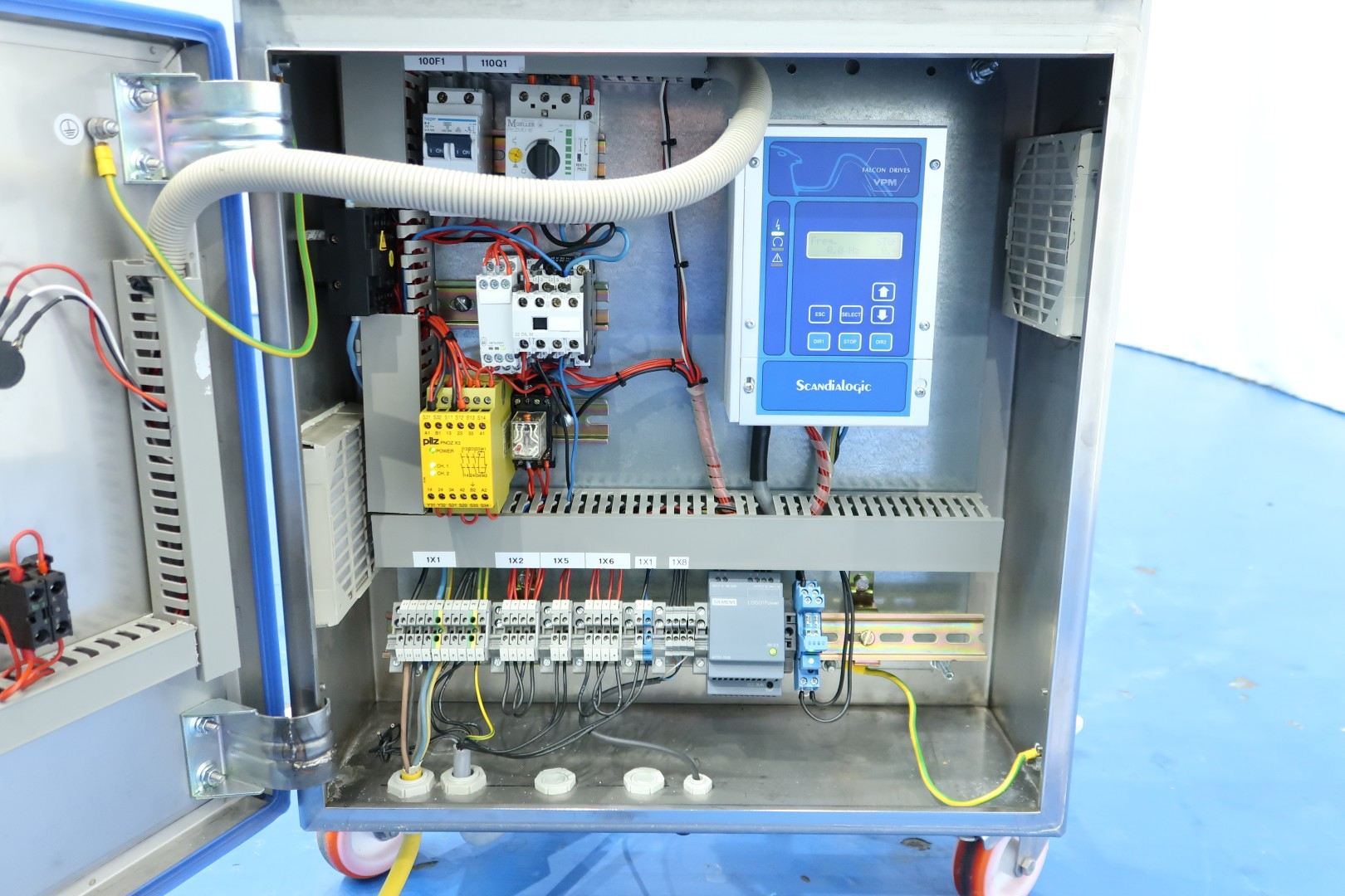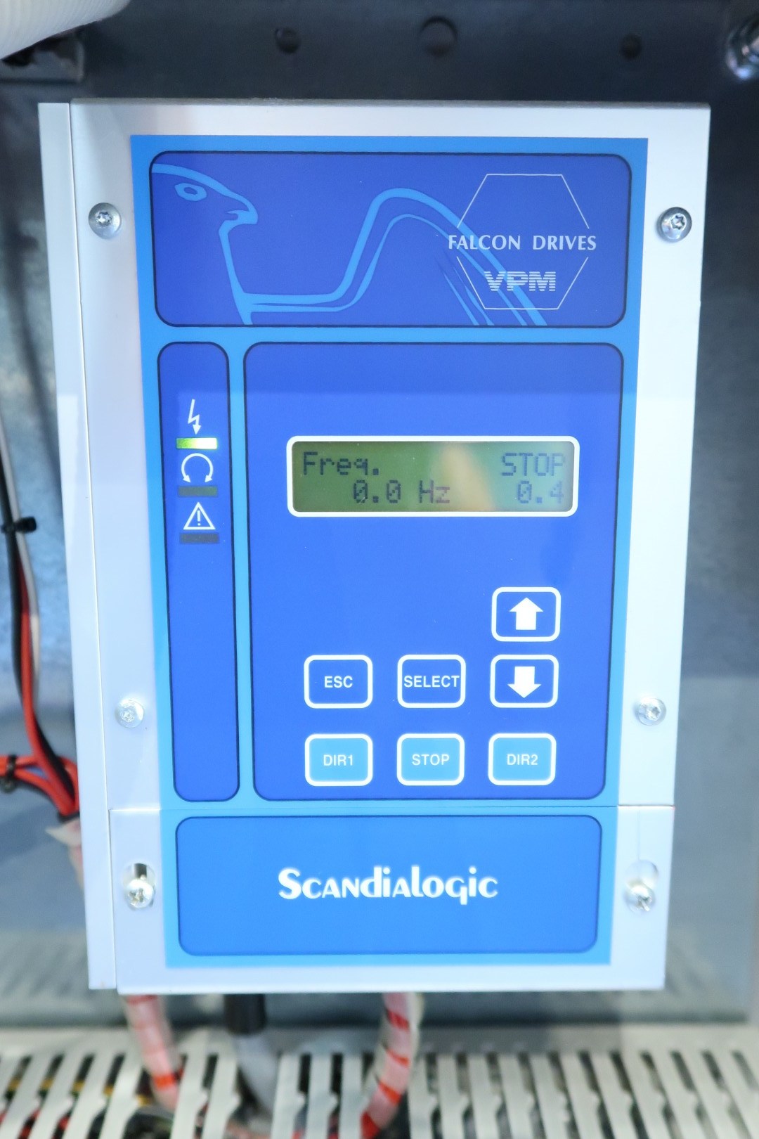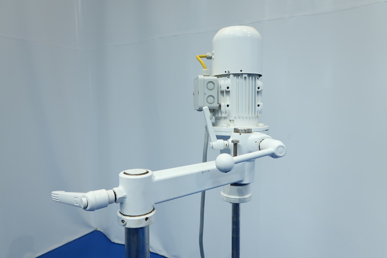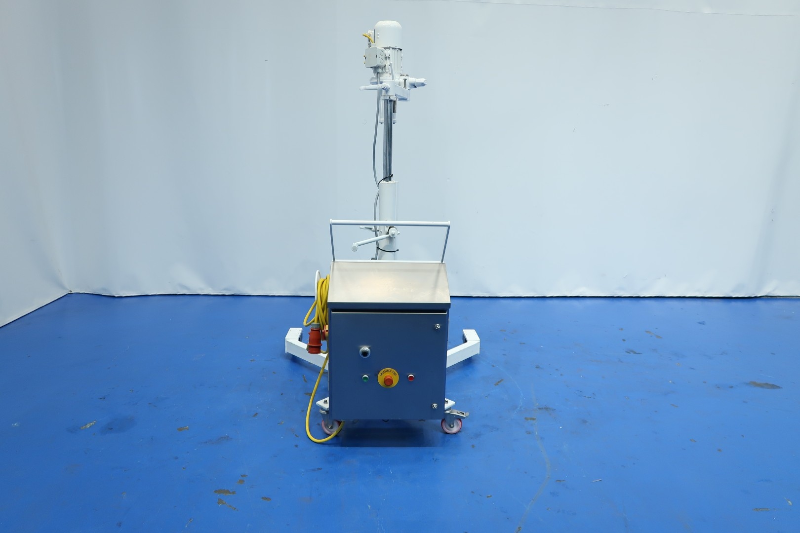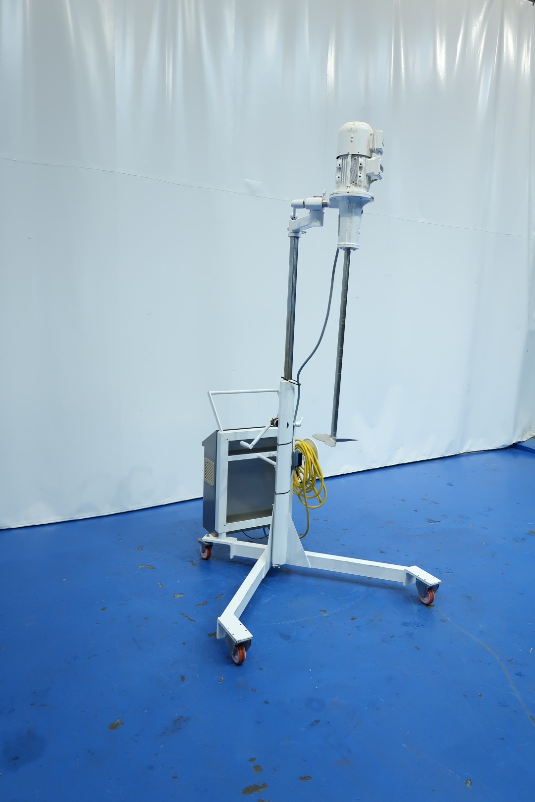 High shear mixer on mobile tripod. Agitator type: propellor. Motor 0,75 kW - 1,88 A - 50 Hz - 1.410 rpm with forced cooling. Controls directly on machine with adjustable speed via frequency convertor. Height mixer manually adjustable. Lowest position 52 cm / highest position 90 cm. With sensor detection for seeing if a bucket or milk can has been placed under the mixer. Documentation: electrical diagram. Documentation available. Total dimensions: 130x120x237 (lxwxh) cm - weight: 142 kg.