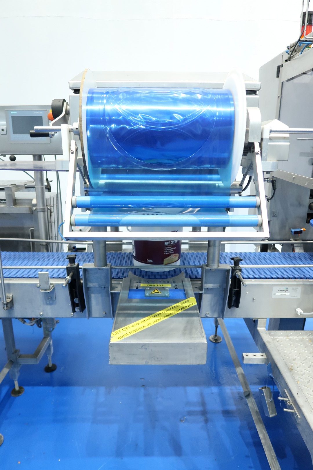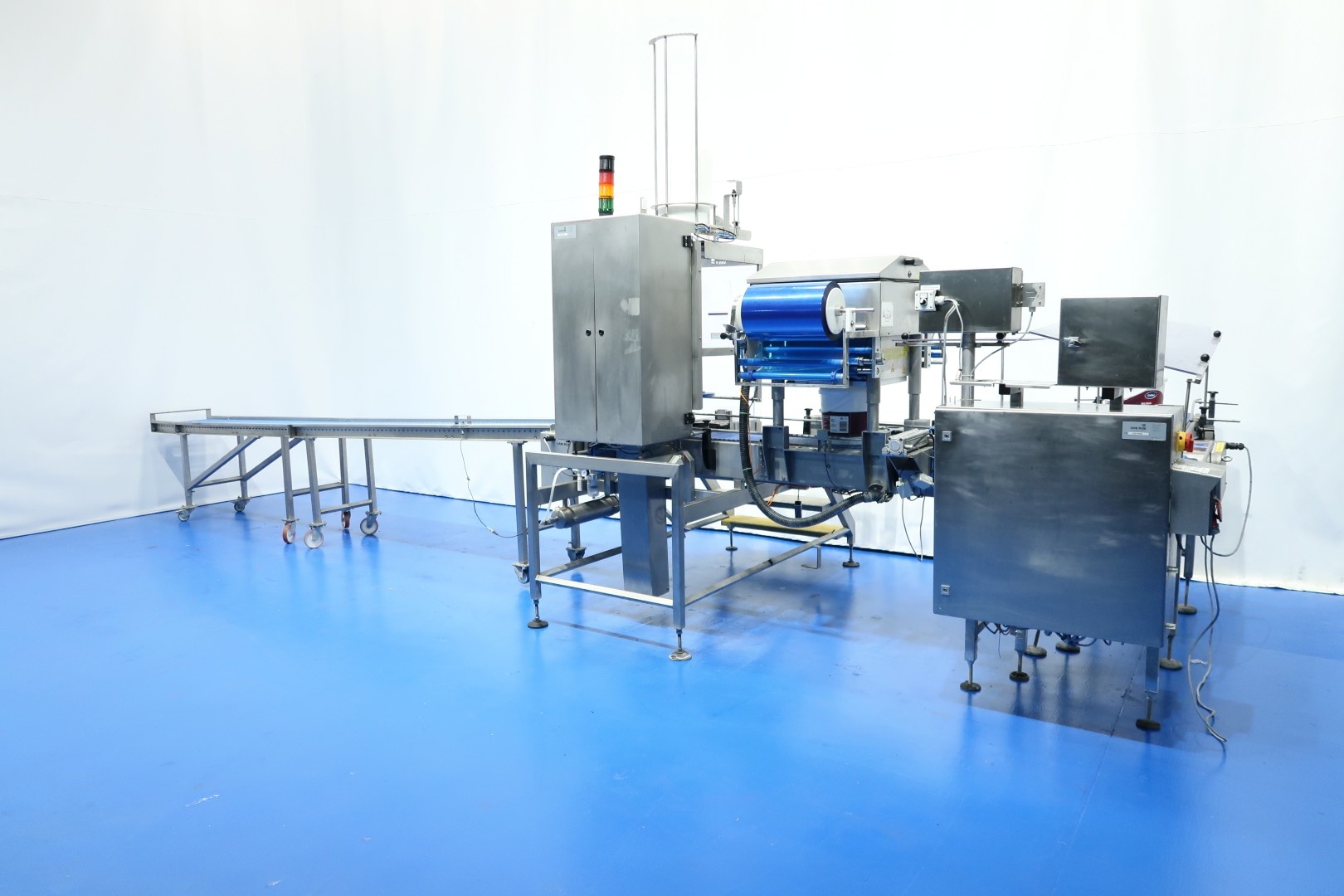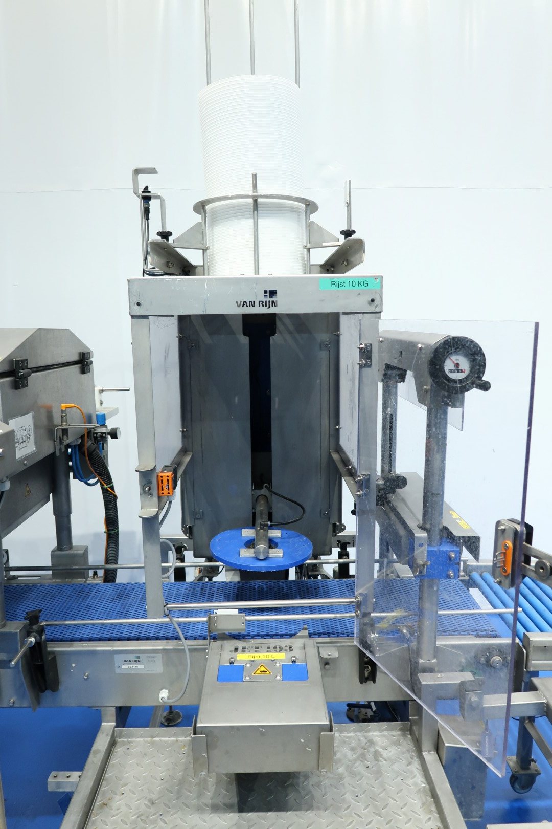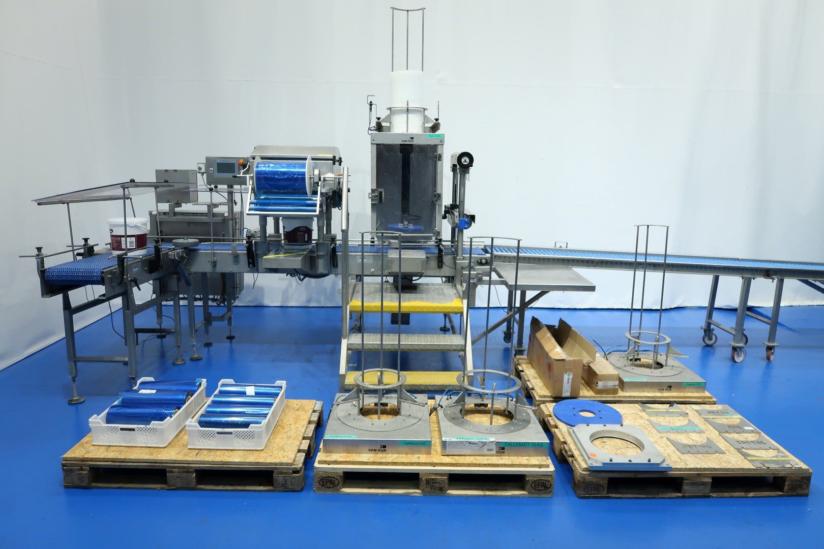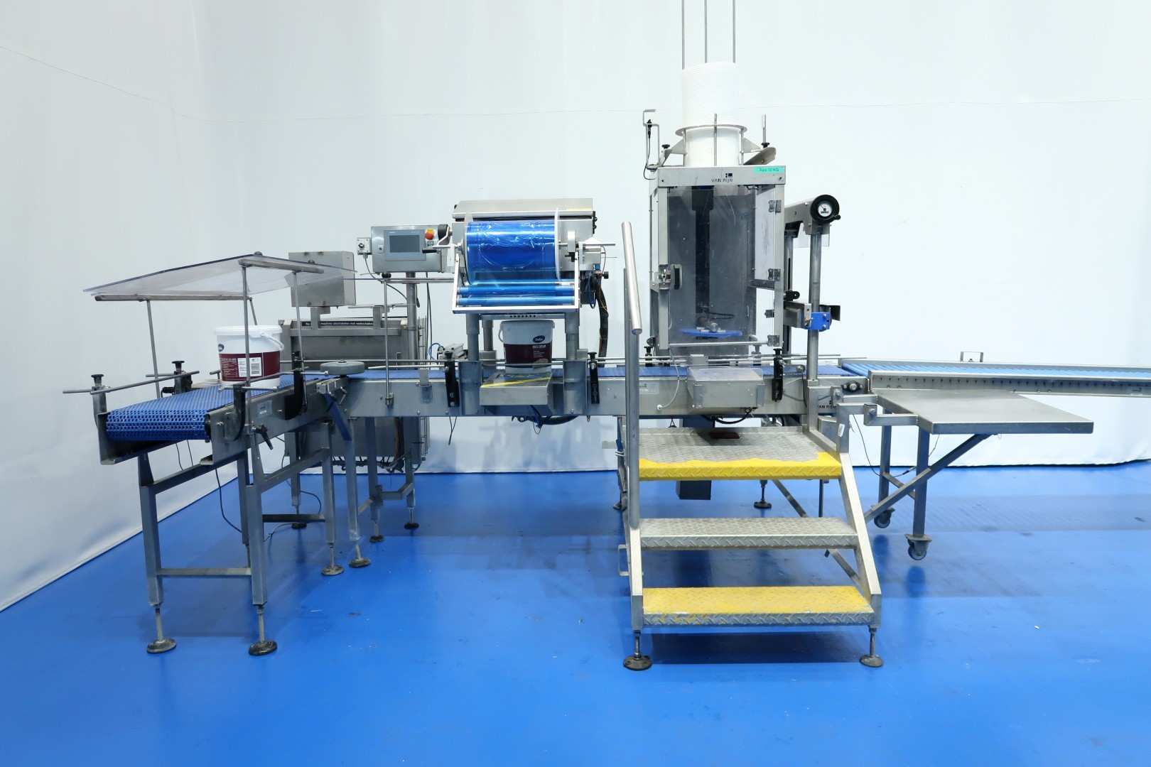 Bucket sealing and lid closing machine. Current formats on machine: 5 kg, 10 kg and 15 kg. Bucket 10 kg inner diameter 25 cm. With 1 x extra sealplate. With seal detection. Wit infeed and mobile outfeed conveyor (length 420 cm - width 40 cm). Steps: 1.) Bucket input to central conveyor with 90° corner 2.) Central conveyor transports bucket to sealer, 3.) Sealing top of bucket including stopcilinder for bucket suply, 4.) transport to lid placing station, 5.) lid pusher, 6.) transport to outfeed buffer conveyor. Stations for foil sealer, lid placer and pusher with positioning slide. Controls Siemens Simatic S7-300 PLC with Hmi screen on machine. Documentation available (in Dutch).