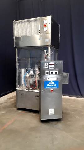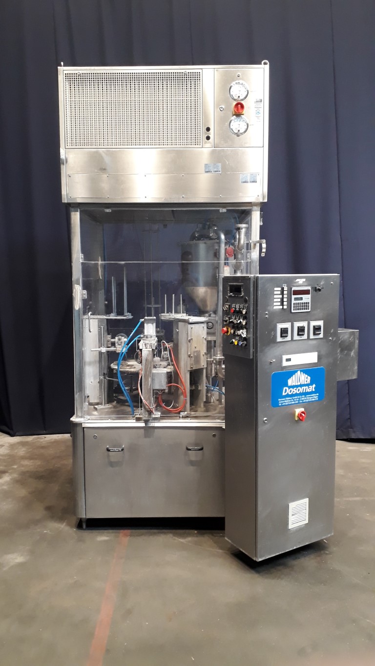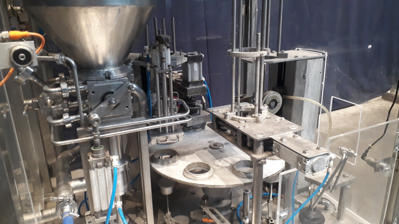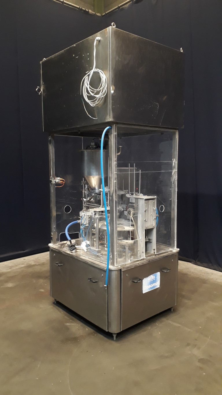 Rotary filler with 1 head. Cup size round: 95 mm. Stations: cup destacking, no-cup detection, main doser (150 - 500 ml) for viscose liquid products, 3 different filling nozzles available for different viscosities. with hopper (CIP cleanable), lid dispensing by vacuum, heat sealing, snap-on lid. Without outfeed conveyor. Machine has plexiglas safety guards (1 door missing). Machine is in clean exection with an hepa sterile air system with blower mounted on top of the machine. Controls: Siemens, model: S5 and HMI. Documentation available. Total dimensions: 160 x 170 x 300 cm.