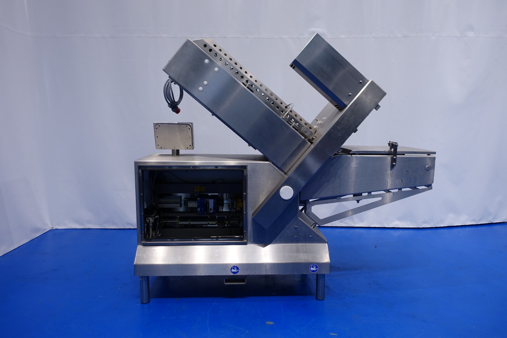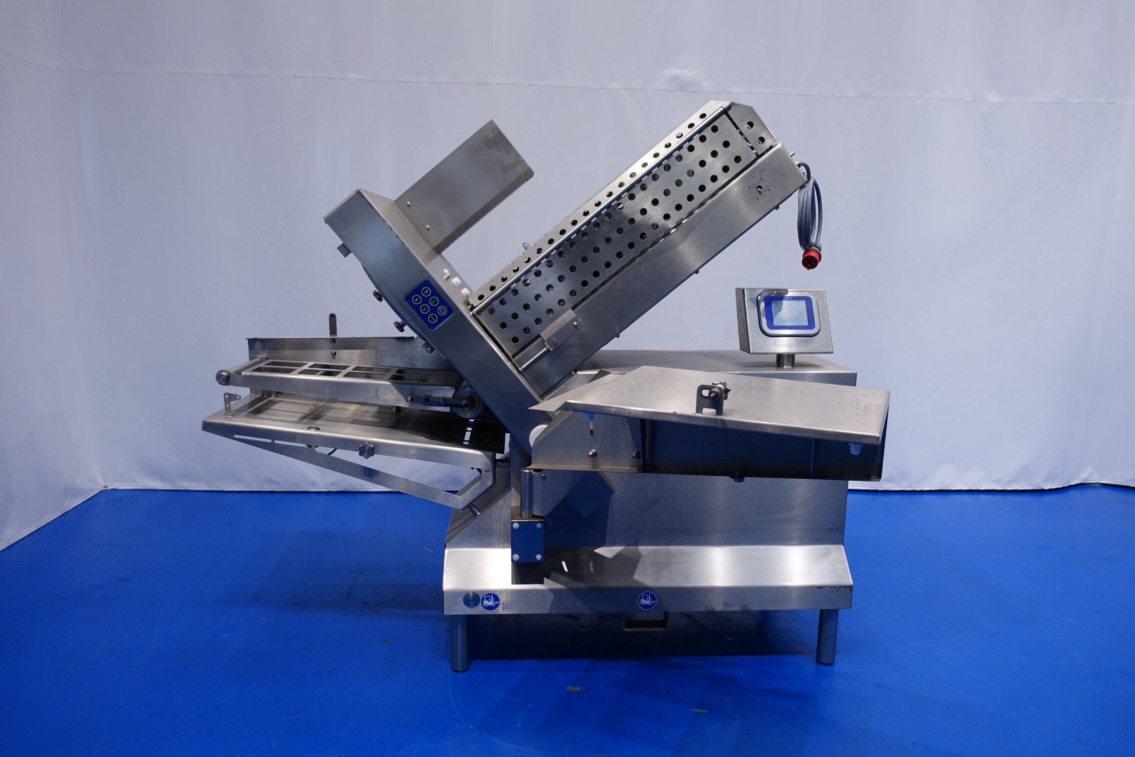 Cheese slicer with circular blade and a manual loading. Easy to operate and to change applications. Both slicing edge and slicing stop can be adjusted to the product width. To produce stacked portions, This Slicer 305 -117- UB is equipped with a stack lowering device, which guarantees the gentle placement of each individual slice and precisely portioned stacks. Total dimensions: 230x80x205 (lxwxh) cm - weight: 916 kg. Currently without backplate and knive cover.