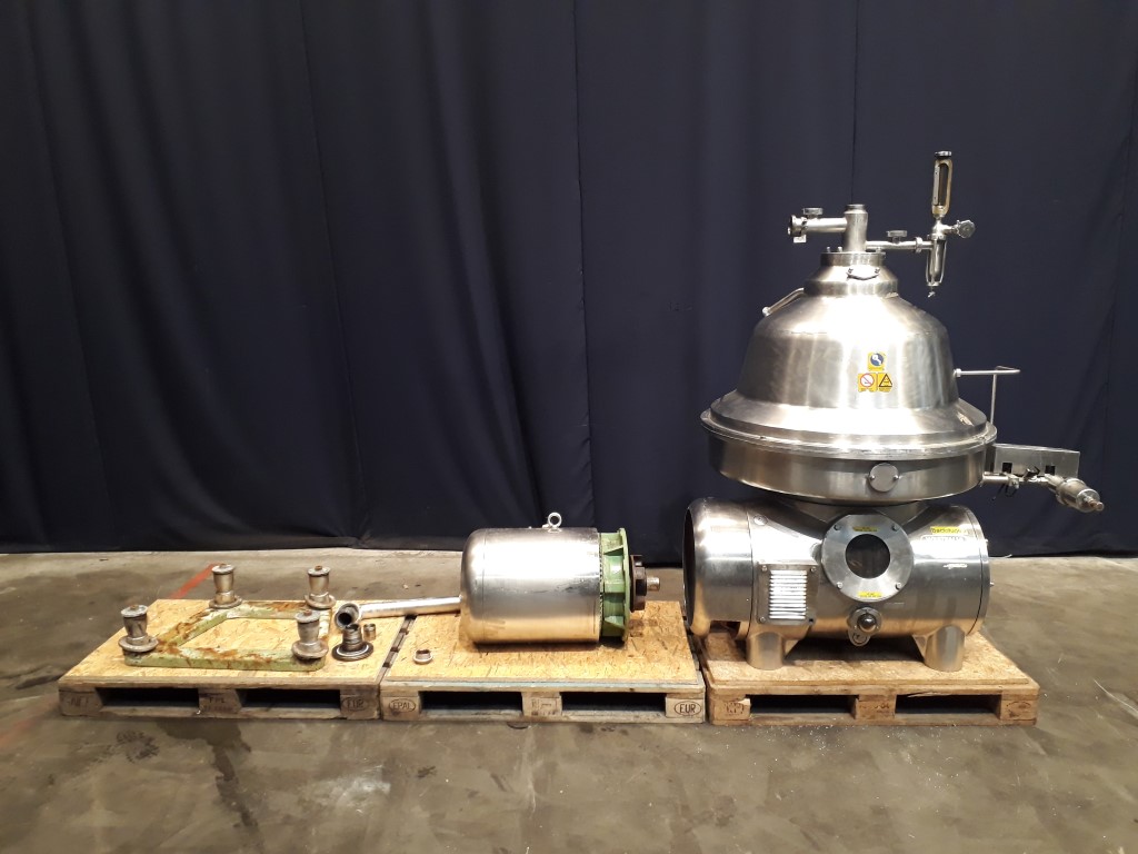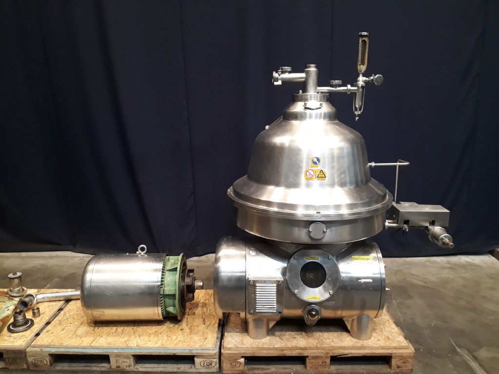 Incomplete bactofuge, excluding bowl. Including: Motor 37 kW - 72 A - 1475 rpm, motor cover, base frame, manouvering water valves. Excluding: Bowl, inlet/oulet pipe, centripetal pump bactofugat, sludge collecting tank, counter pressure valve milk, flowindicator and flow regulation valve for bactofugat, centripetal pump for concentrate, clutch, tools and controls. for parts only.