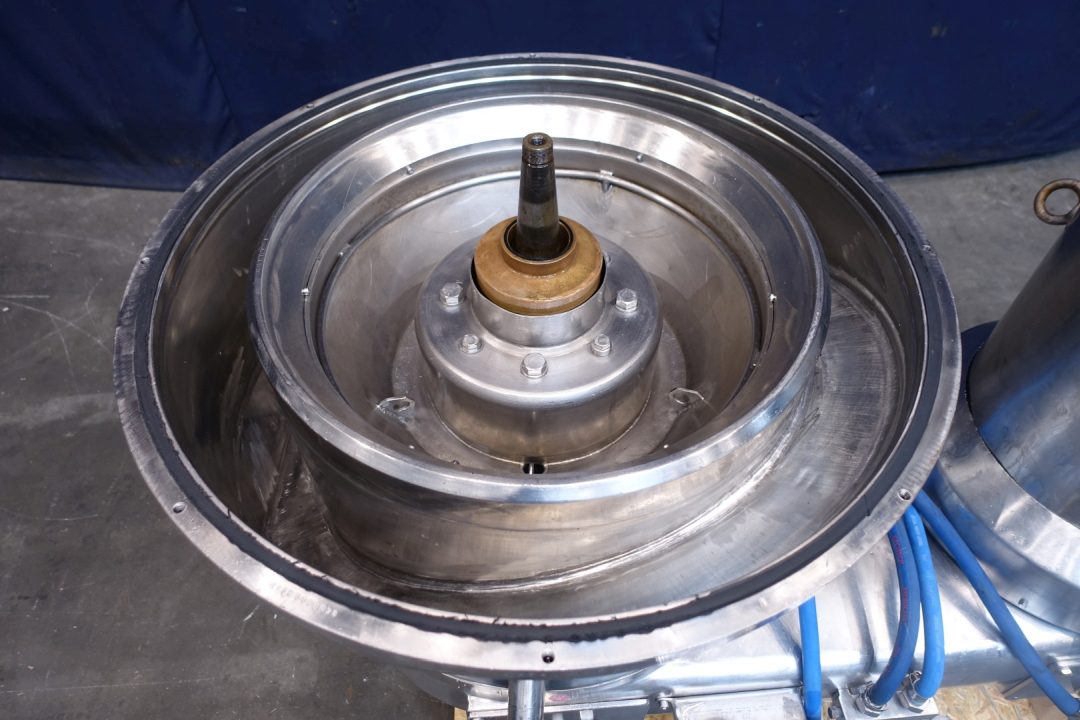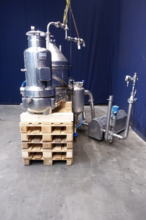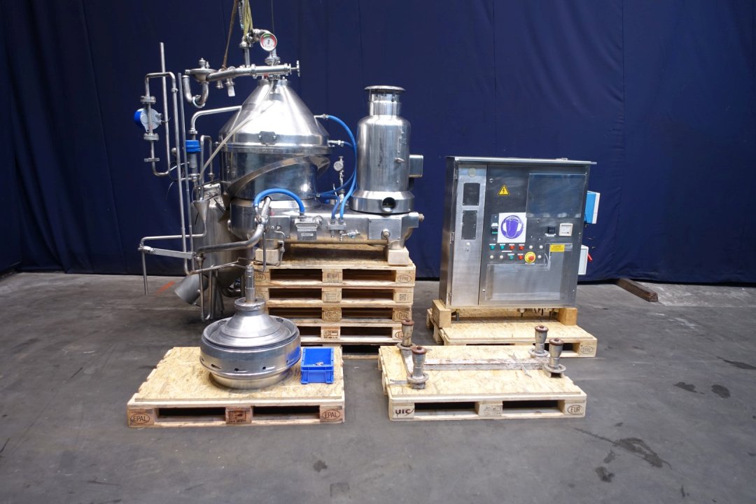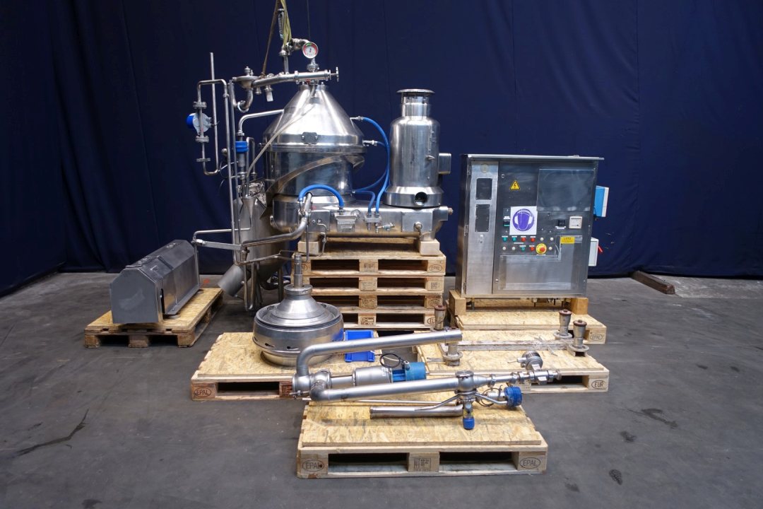 Quark separator, CIP cleanable. For the production of quark / greek style yoghurt/Labney/Skir. Input 5,500 up to 8,000 ltr/h of skim milk. Output up to 1,500 kg/h depending required dry matter in end product, total solids up to 22 %. Motor, air cooled power: 20 kW - 37,5 A - 2.910 rpm. Bowl (with 12 nozzels, 5x 0,5 and 5x 0,6), bowl speed: 5.350 rpm, closed product collecting tank 100ltr, with spraybowl on outfeed, Manual, and automatic (Tetra cpmp) counter pressure valve whey, flowindicator and sight glass on inlet, Outfeed product lobe pump (Waukesha 060U2C: lobe Ø 160mm - 4,0kW - 9,1A - 1.420rpm) with bypass cip valve, Control panel and baseframe. Excluding tools, inlet filters. Weight: ca 1.182 kg.