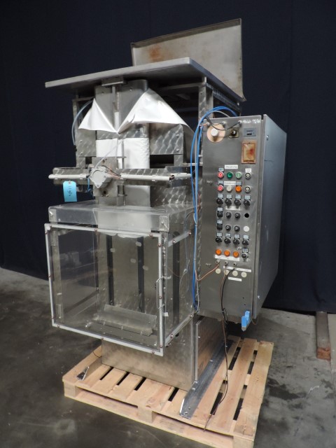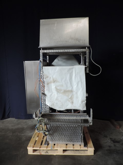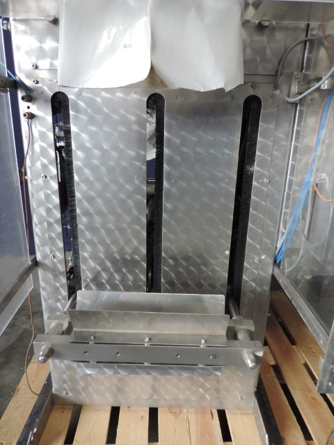 Vertical transwrap form fill seal machine. Sholder size 330 x 65 mm, length adjustable. For 5 and 10 ltr plastic bags, from a roll by heatsealing. Pneumatic driven, For thin liquid products like milk or water. Time filler. CIP cleanable.