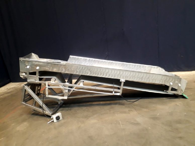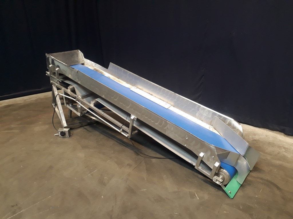 Belt conveyor with stainless steel frame. Belt width: 450 mm. Belt Lenght: 3250 mm. Angle approx. 15 degree up, turnable mounted on a frame. Total dimensions: 3300 mm x 700 mm x 1300 mm.