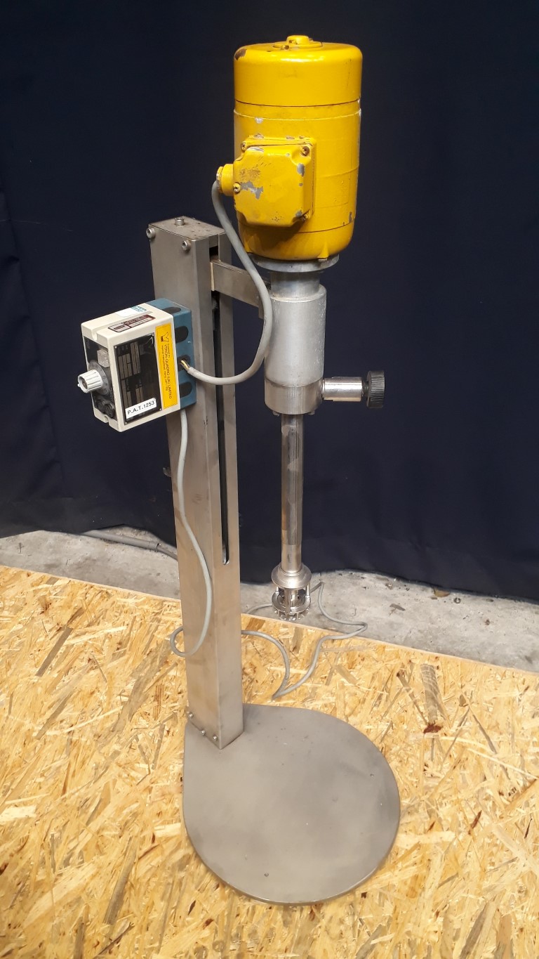 Agitator with rotor-stator principle mixer. Shaft length: 280 mm. Propellor diameter: 50 mm. Height adjustable 60 - 370 mm above base plate. Inlet for liquids around the shaft. Speed control in several steps. Total dimensions: 45 x 35 x 105 cm.